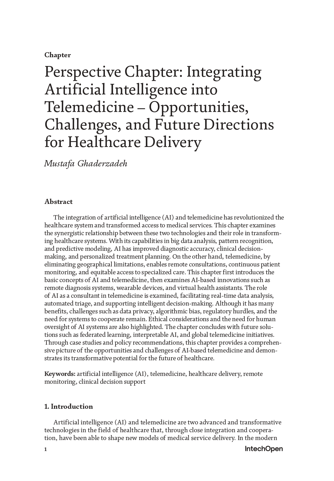 Perspective Chapter: Integrating Artificial Intelligence into Telemedicine – Opportunities, Challenges, and Future Directions for Healthcare Delivery"  توسط این محقق و هیات علمی دانشگاه به چاپ رسیده .